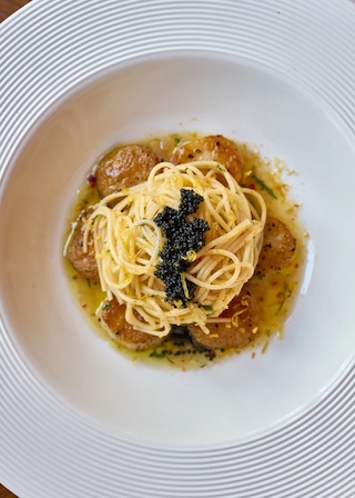Among the starters, the aromatic Seabass Crudo is light and zesty, featuring jalapeños, crisp green apple, refreshing cucumber and fresh herbs. The indulgent second starter, Crab and Lobster Croquettes with crispy fennel and popcorn shoots was served with a side of creamy saffron aioli.