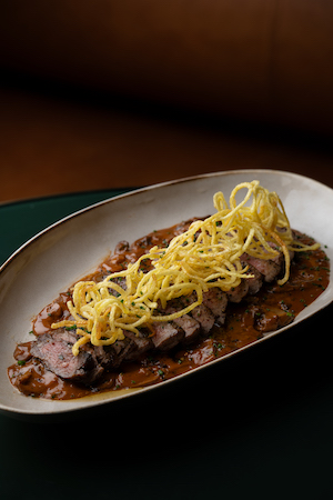 In the mains the hearty plate of grass-fed Steak Frites with a side of peppercorn sauce and parmesan fries is expertly cooked. Seafood enthusiasts should pick the newly introduced harissa-crusted seabass that is delicately perched atop roasted vine leaves and finished with a bright drizzle of lemon, olive oil, and fresh chives.
